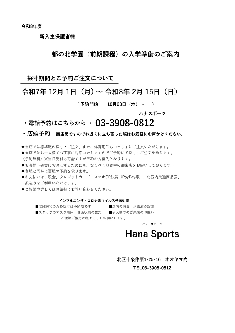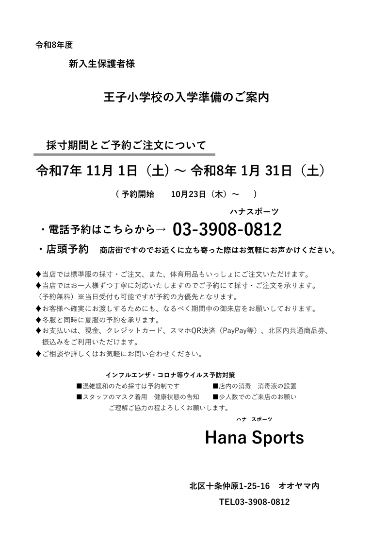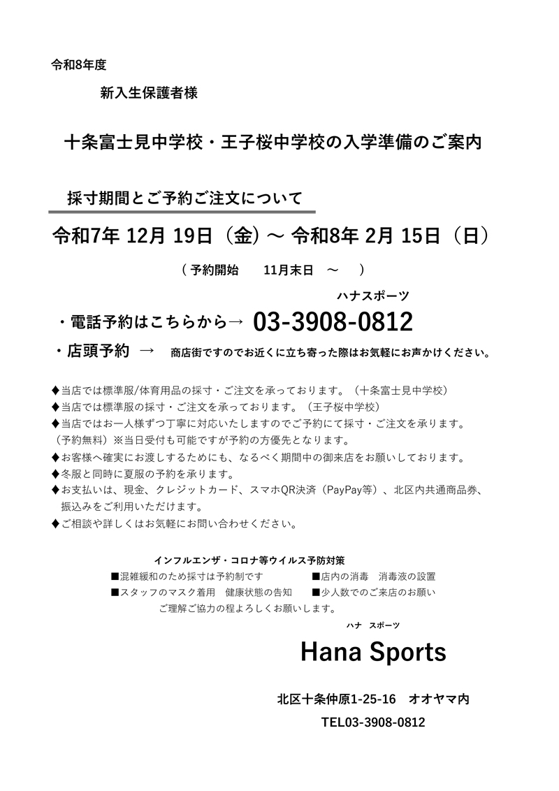 ハナスポーツ ハナスポーツ お知らせ ★12月★ 今月より十条富士見中学校、王子桜中学校の採寸のご予約を承っております。 是非ご利用ください♪ 〇都の北学園(前期課程) 〇王子小学校 採寸ご注文スタートしております。 ★12月ご予約情報★ 年内の土日はまだ空きがございますのでお早めにご予約ください。 平日はご希望に沿える日時はございますのでお問い合わせください。 ※王子… -